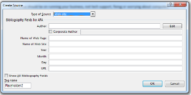 One of the more useful functions of this tab is the ability to do in-text citations. These allow you to cite sources in the middle of your paper. You click Insert Citation and Insert New Source, and this window will appear: